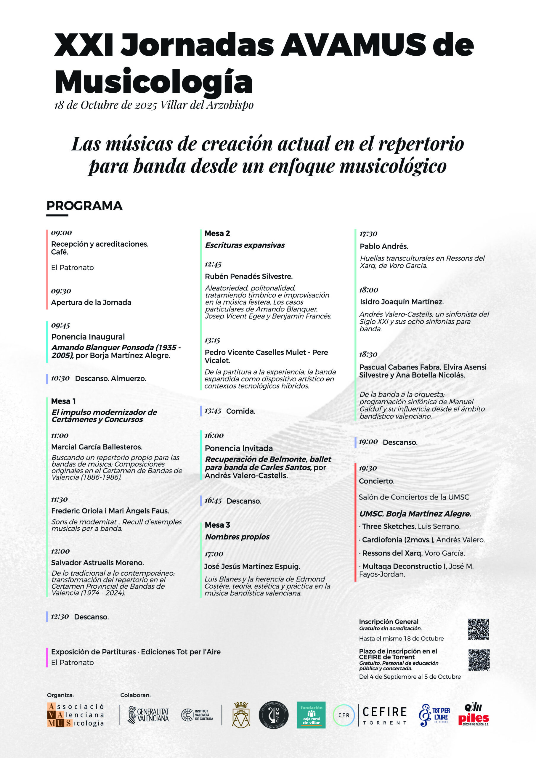 De este modo, el objetivo de esta jornada sería presentar investigaciones que hagan hincapié en la influencia en el repertorio bandístico de corrientes como el serialismo, la aleatoriedad, la improvisación, el minimalismo, la electrónica, espectralismo, soundscape, arte sonoro, performance, técnicas extendidas, sin excluir otras.